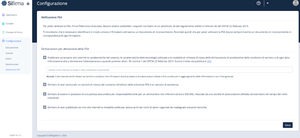 2. Dichiarare di aver assicurato un servizio di revoca del consenso all’utilizzo della soluzione FEA e un servizio di assistenza.