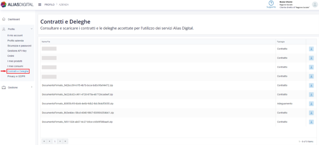 Per poter visualizzare e scaricare il contratto ed ogni altro documento firmato, è possibile accedere alla voce Contratti e Deleghe.