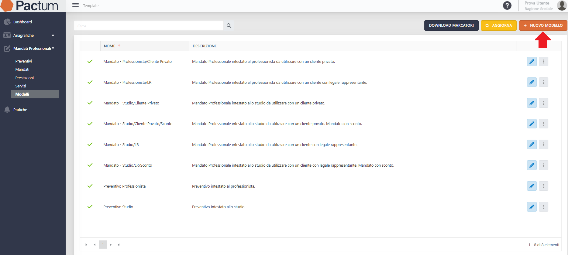 La sezione Modelli contiene i documenti base necessari per emettere un preventivo o un mandato professionale.